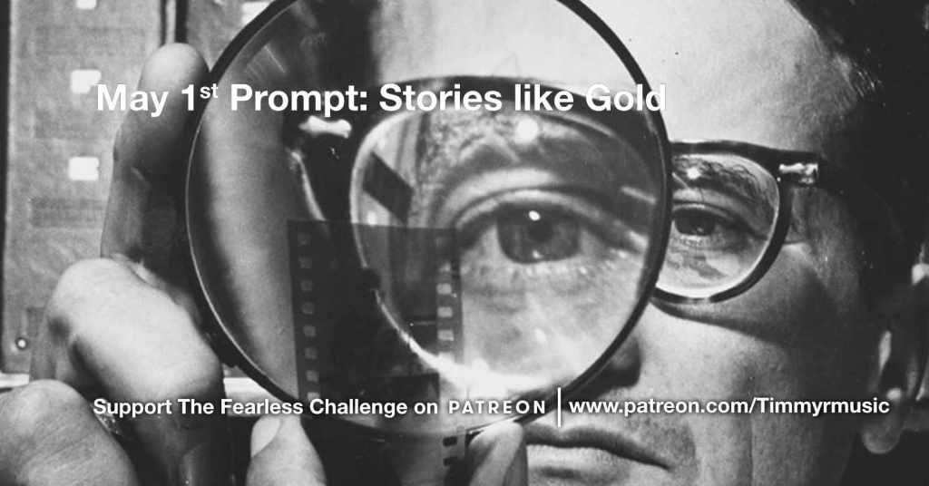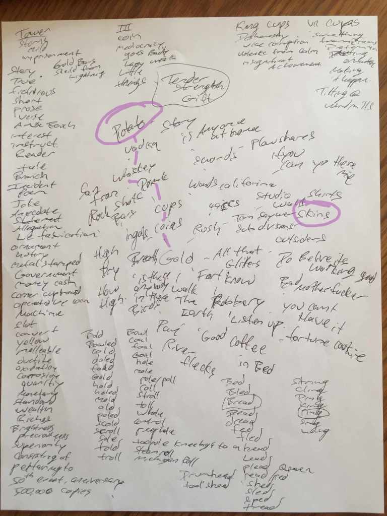 I start the word splatter with an object and place it in the center of the page. Yesterday I chose the word “gold” which is the most object-y word from the prompt “stories of gold.” I branch off words I associate with “gold” in all directions. Then I branch more words from the associations I make. I set a timer set for ten minutes so I don’t go too long. Sometimes I stop early, but there’s always a decent splatter before I stop.