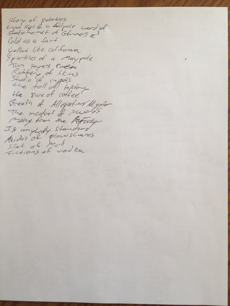 If nothing’s jumping to be written yet, (usually it’s not and it wasn’t yesterday), I write some metaphors from what I’ve drummed up on my word splatter.