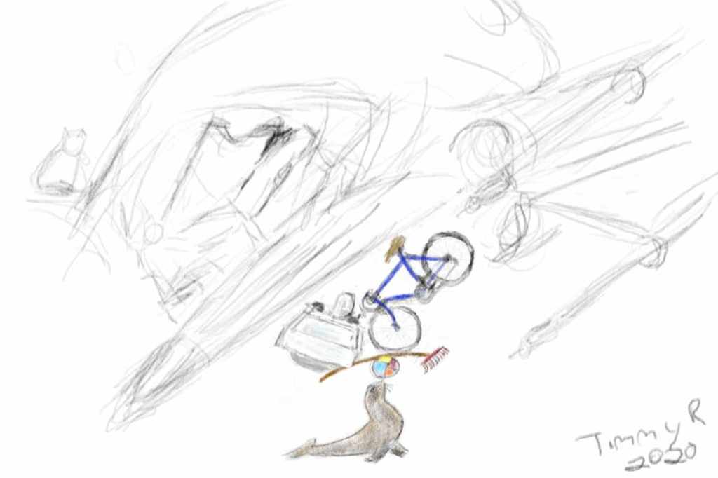 Here’s an update on the incomplete drawing from Monday. The progress is in the bicycle which has been a little better defined, and is now blue. “Slow and steady wins the race;” my second grade teacher used to say.