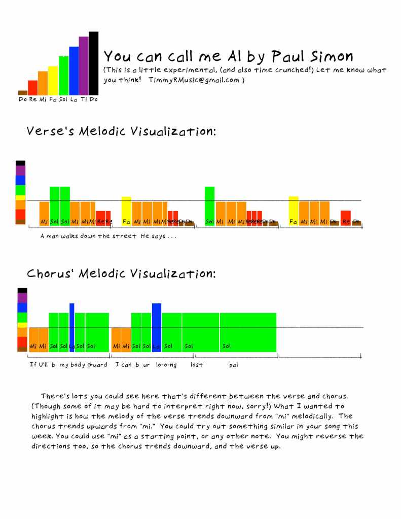 I woke up started flipping through my “Definitive Paul Simon Songbook.” What would be a good song to play around with? I settled on “You Can Call Me Al.” It’s a fun song. A simple riff, given lots of texture in its recording, with a bright chorus. There’s a lot a person could glom onto and focus on. The part I might be cool to play with for this week is that the melody in the verse mostly trends downward. In the chorus, the melody mostly trends upward. It’s a cool way to differentiate the two sections. What if you were to write a song in which the melody mostly arcs downward in the verses, and mostly arcs upward in the chorus? (Or vice versa)?