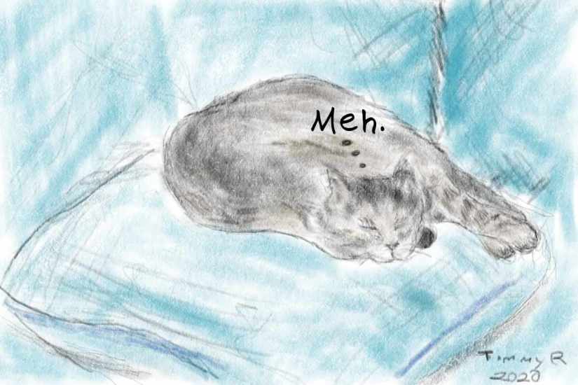 It’s interesting to see in my illustrations, perhaps some subconscious messages poking their little head into the sunlight. The kitty saying “Meh,” a perfectly reasonable and appropriate thing for a cat to say in popular culture’s telling of cats. But I could have said anything. Or nothing at all. Good ‘ol Beanie could have just napped on his couch: