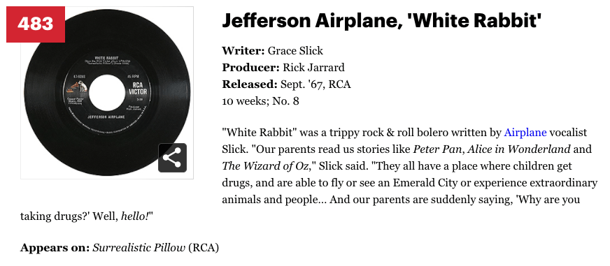 This week we arrive at #483 on Rolling Stones list of the 500 Greatest songs, White Rabbit, by Grace Slick, (performed by Jefferson Airplane). Without going through the list, I don’t know if I’d have looked at this song’s structure , and there’s a lot that’s really cool going on here.
