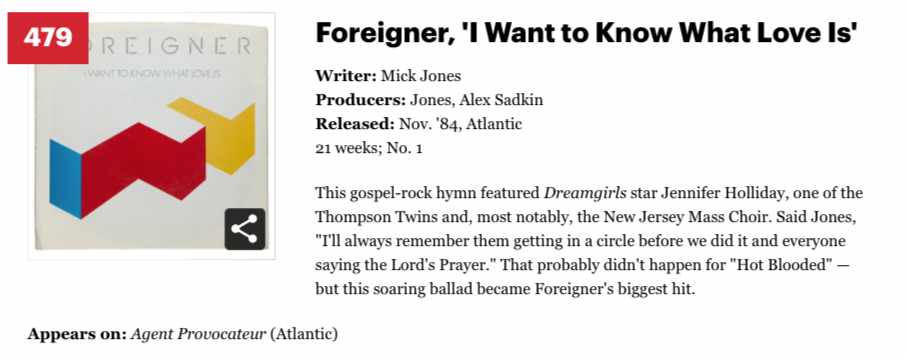 I hear Foreigner’s “I Want to Know What Love Is,” and think “middle school slow dance.” It’s a perfect song to sway to. It also comes in at #479 on Rolling Stone’s list of the Greatest Songs of All Time. Written by guitarist Mick Jones, it is Foreigner’s biggest hit. As a classic power Ballad, the song’s chords are pretty straight forward, but it does some noteworthy things with how it places those chords in time. My middle school associations aside, it’s definitely worth checking out.