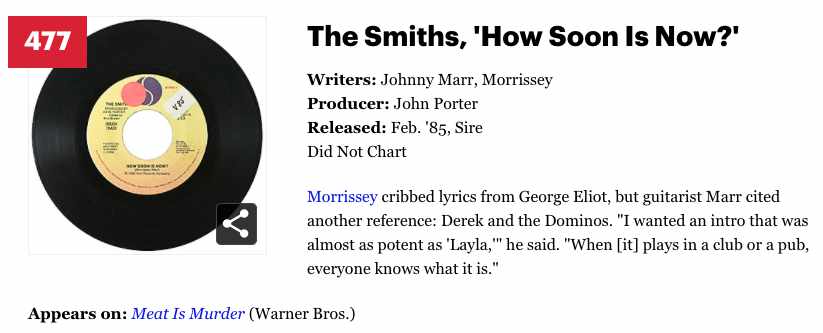 “How Soon Is Now” by The Smiths is one of those songs I’d heard dozens of times, but I never knew who wrote it or what its title is. It’s a haunting, tremolo grumble of a song, with airplane like air raid sirens played on slide guitar. To me, it’s one of those songs that sounds like it’s always been out there, lurking. It also happens to come in at number 477 on Rolling Stones list of all time greatest songs. Enjoy!