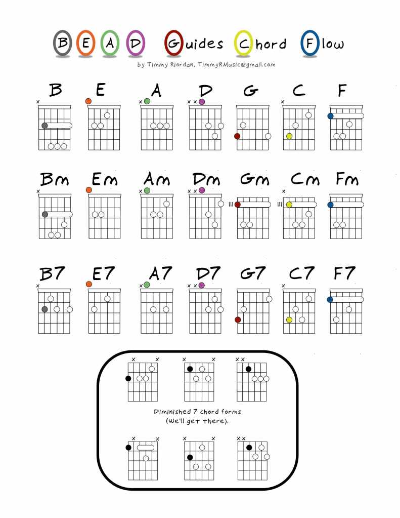 Here’s a page I worked up this week. It’s a map of the chords in BEAD Guides Chord Flow. (I skipped the flat and sharp chords for this sheet to keep it simple). The first row is major chords in BEAD GCF order. The second row is minor chords. The third is (dominant) 7s. Eventually this will all be part of my book.